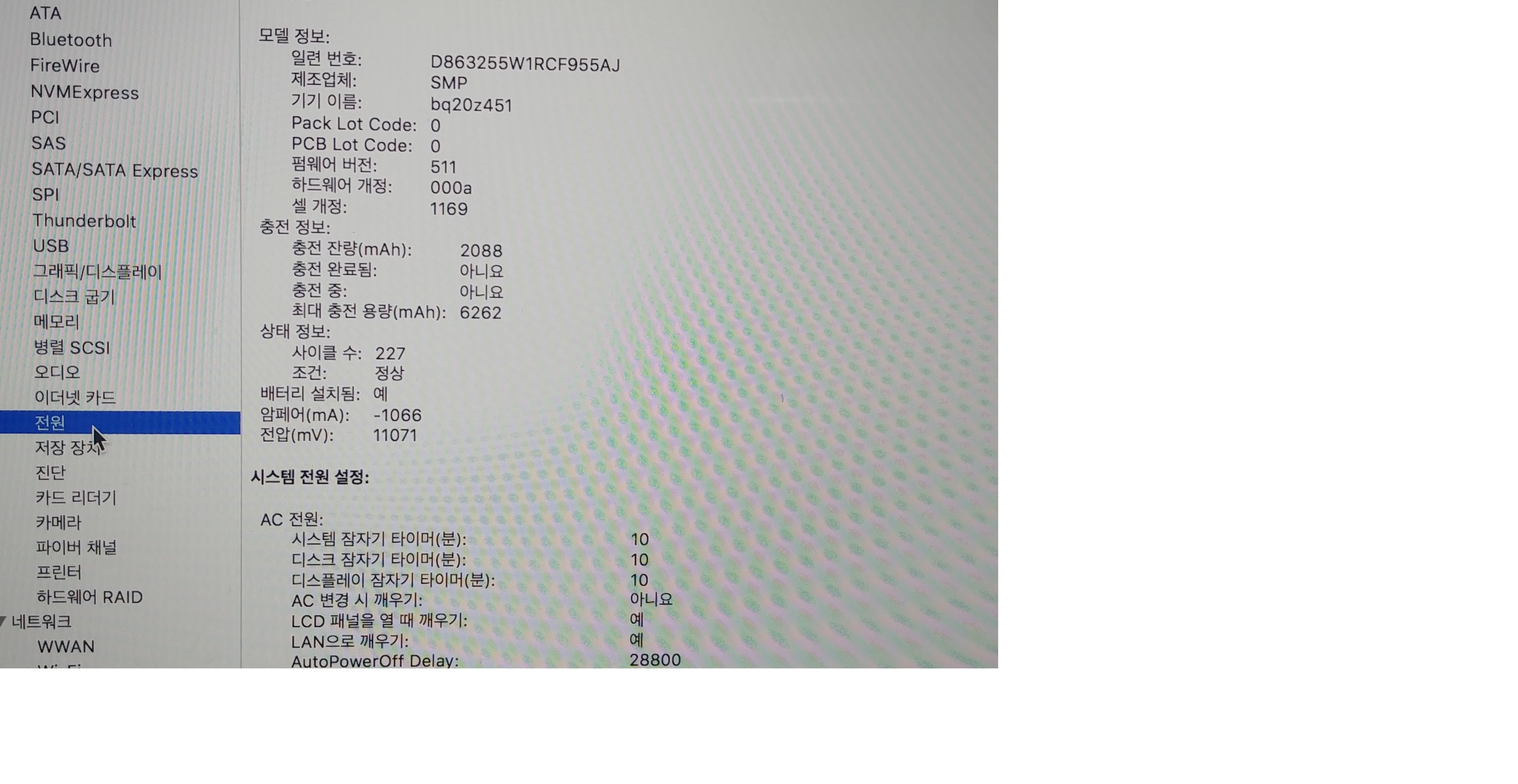 배터리 사이클 227  최대충전용량 6262