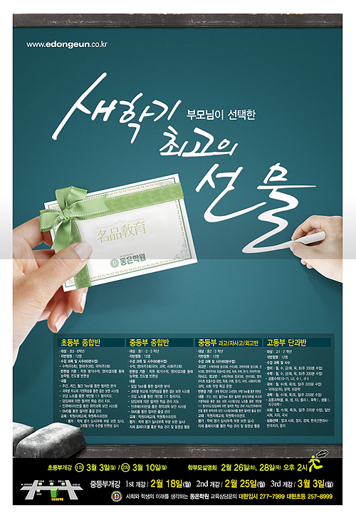 동은학원... 한참을 보고 있었네요. 전 회사에서 동은학원하고 거래 했었는데 엄청 까다로웠거든요~ 하나 고치고 웹하드 올려라~ 또 하나 고치고 웹하드 올려봐라~ 정말 피곤한 거래처였음. 전단 너무 깔끔하니 이쁘네요~ ^^