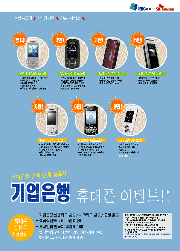 k100+c30을 배경색으로 깔고 이밴트라고 고딕계열의 굵은 서체로 써준다음... 글씨뒤쪽에서 휴대폰이 하나하나 머리를 내밀고 중간 정도부분에 좌측부분에다가 기업은행 휴대폰 이밴트 두줄로 써준다음 그 글씨 우측에다가 제품하나하나 설명을 다시넣고 하단에 기업은행로고와 각종 내용들을 정리해주는것도 좋아보일거 같은데요... 아니면 휴대폰 이미지하나 크게넣고 이밴트를 상단으로 잡아보시던지요... 요즘느끼는건데... 얼마만큼 고민하냐가... 디자인에 미치는영향이 가장큰거같아요... 좋은이미지보다도 생각이 먼저라는걸... 뼈저리게 느낍니다... ㅜ.ㅜ